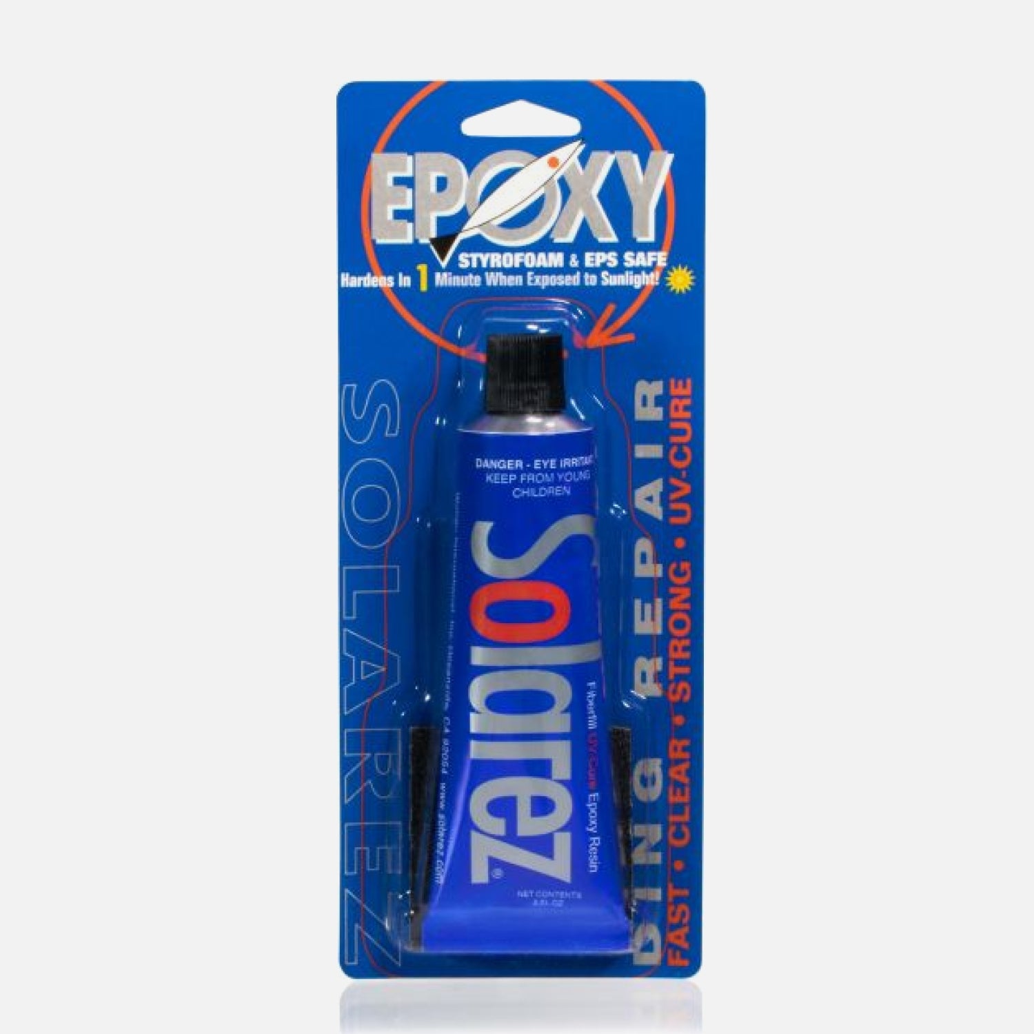 La misma fórmula probada durante más de 20 años ha salvado a muchas tablas de surf de los peligros de la inducción de agua en países de todo el mundo. Fácil de usar: prepare con arena (grano 60) la superficie alrededor de la abolladura, exprima suficiente solarez para rellenar la abolladura, cubra la resina húmeda con una bolsa de plástico, alísela, EXPÓNALO A LA LUZ DEL SOL DURANTE UN MINUTO O DOS. Ahora, despegue la bolsita y haga un lijado de retoque menor con el lado de grano 240 y ¡VAYA A SURF!